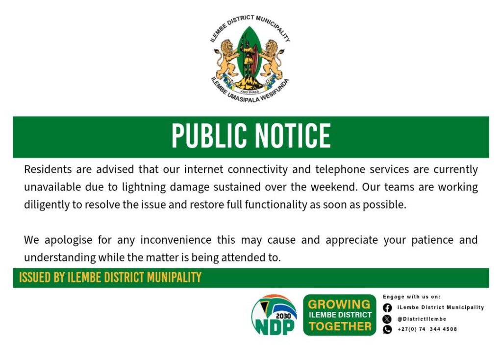Residents are advised that our internet connectivity and telephone services are currently unavailable due to lightning damage sustained over the weekend. Our teams are working diligently to resolve the issue and restore full functionality as soon as possible.